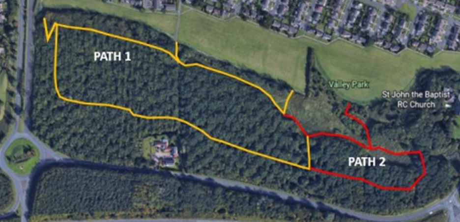 The current woodland has a network of footpaths of which the main paths throughout the site are crushed stone footpaths. These paths were all resurfaced during 2023 as part of Northumberland County Councils Commemoration program to celebrate the life of Queen Elizabeth II. Other paths are generally dirt tracks used to link various sections of the site.